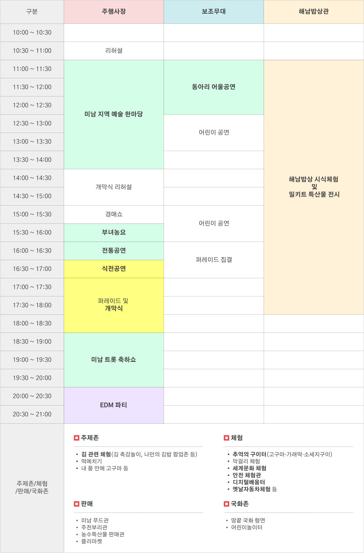 | 즐길거리 | 🍚 해남 먹거리 장터, 지역 예술인 문화 공연, 농수특산물 직거래 마당 |