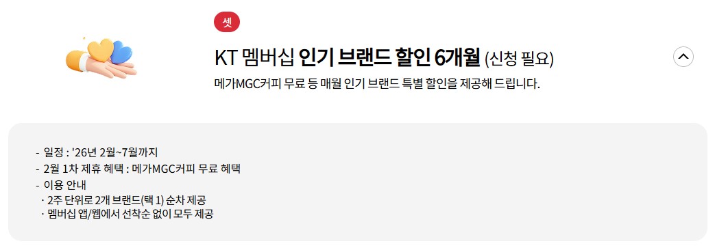 KT 멤버십을 통해 매월 2회, 회당 최대 2개 브랜드 중 하나를 선택해 할인 또는 무료 혜택을 받을 수 있다. 2월에는 메가MGC커피 무료 혜택이 제공되며, 이후에도 커피·외식·생활 브랜드 중심의 혜택이 이어진다. 선착순이 아니라 기간 내 사용 가능하다는 점도 장점이다.