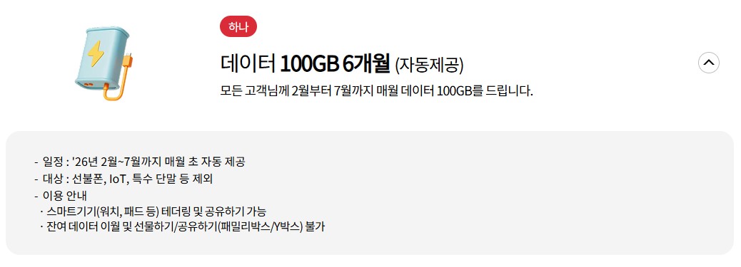 KT 무선 이용 고객에게 매달 100GB의 추가 데이터가 자동으로 제공된다. 별도 신청 없이 2월부터 7월까지 총 6개월간 지급되며, 테더링이나 스마트워치·태블릿 등 데이터 공유도 가능하다. 영상 시청이나 재택근무, 데이터 사용량이 많은 이용자라면 가장 체감도가 큰 혜택이다.