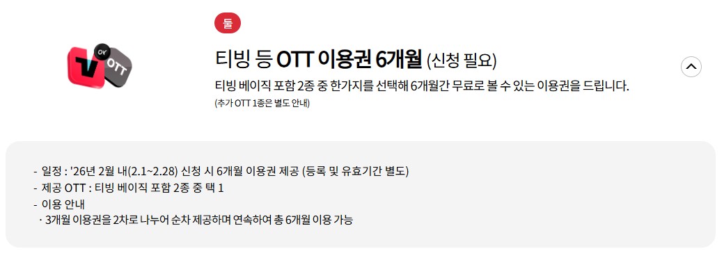 OTT 혜택은 2월 한 달간 반드시 신청해야 한다. 티빙 베이직을 포함한 OTT 2종 중 1가지를 선택할 수 있으며, 신청 시 3개월 이용권이 두 차례 제공돼 총 6개월간 무료로 이용할 수 있다. 신청하지 않으면 혜택을 받을 수 없다는 점에서 가장 주의가 필요하다.