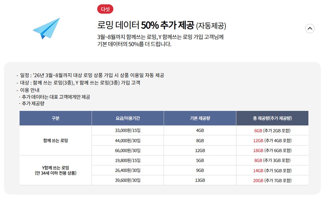 ⑤ 해외 로밍 데이터 50% 추가 (3월~8월)