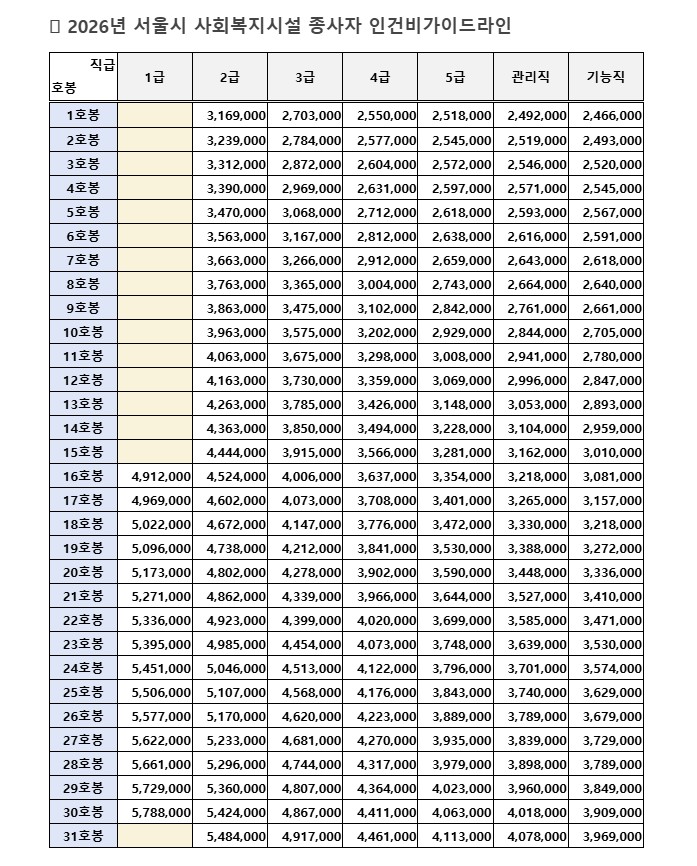 서울시 복지시설 종사자 인건비는 공무원 보수 인상률과 동일한 수준으로 평균 3.5% 인상됩니다.
