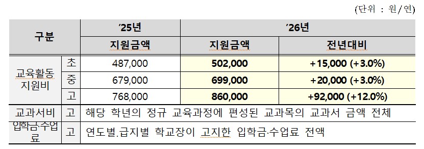 - 교육급여는 2026년 교육활동지원비를 연간 초등학교 50만 2,000원, 중학교 69만 9,000원, 고등학교 86만 원 등 올해 대비 평균 6% 수준 인상