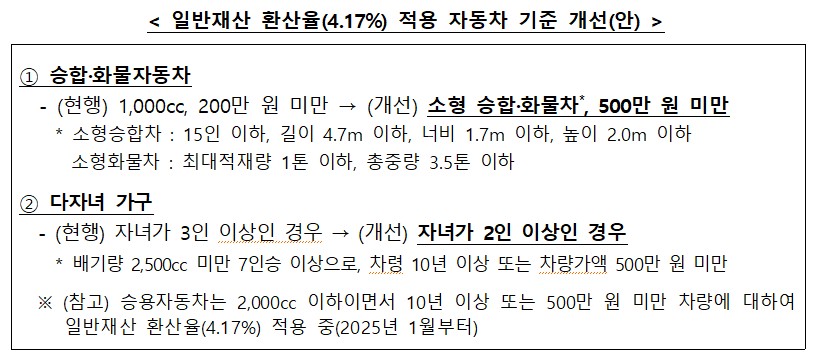 - 내년부터는 승합·화물자동차와, 다자녀 가구의 자동차에 일반재산 환산율을 적용하는 기준을 완화
