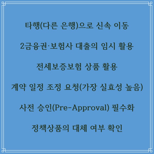 급하게 잔금을 치러야 한다면 보험사·저축은행 등 2금융권 대출을 임시로 사용 후 추후 은행 대환대출로 갈아타는 방식도 고려할 만합니다.