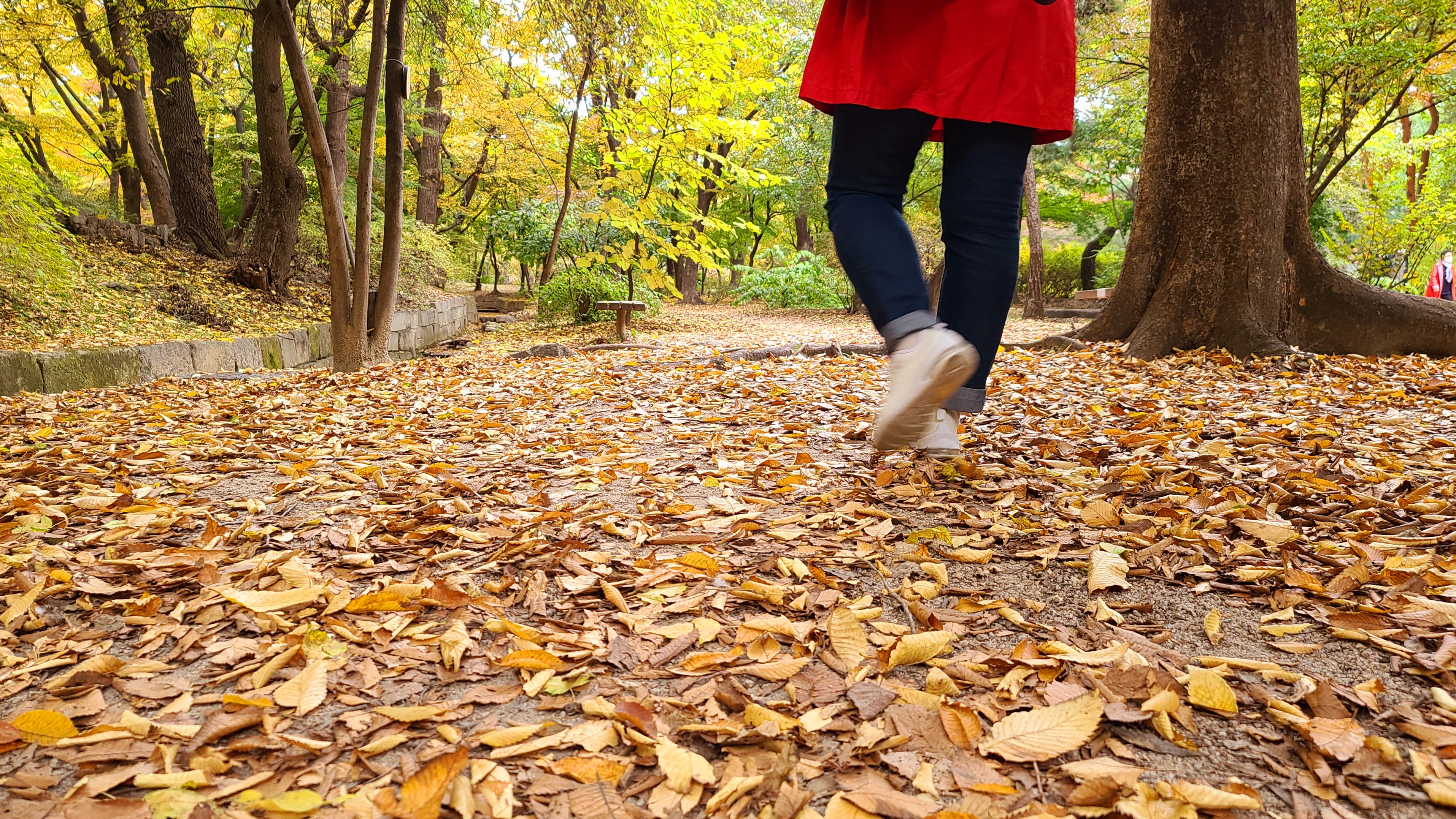 - 황금빛 러닝 라이트(해 질 무렵) + 노란 은행잎 조합은 감성 사진에 제격입니다.